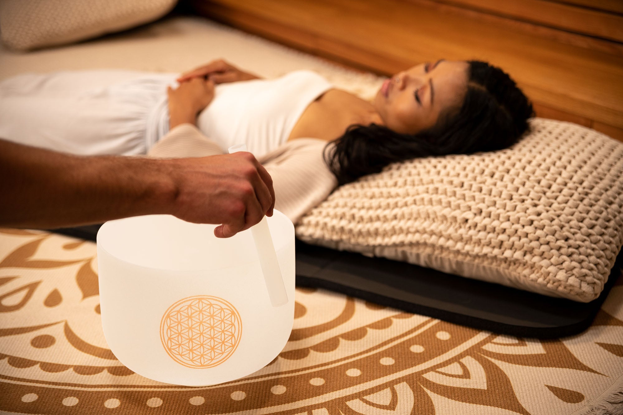 10" White-Frosted Crystal Singing Bowl, Flower of Life 128 Hz