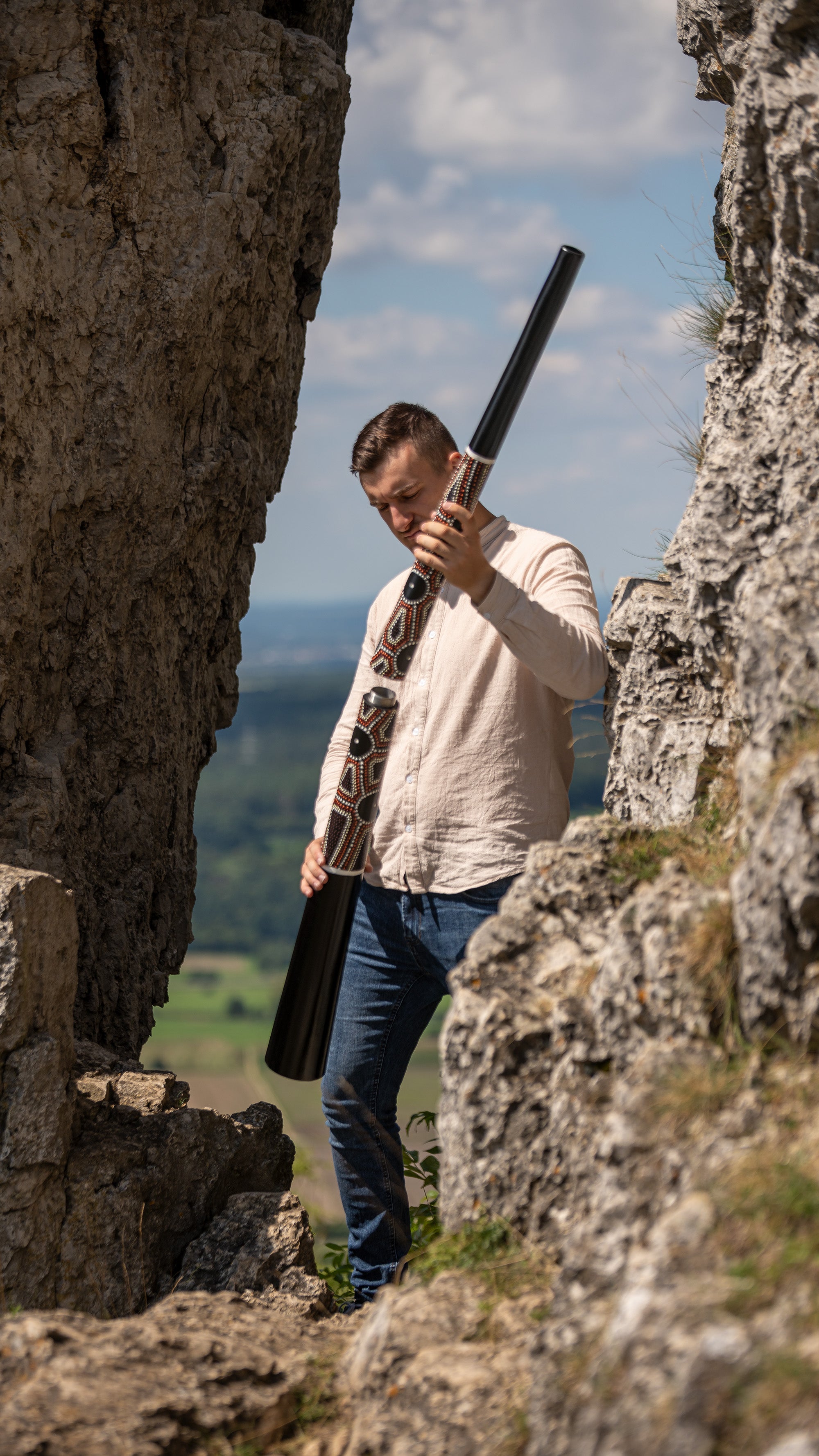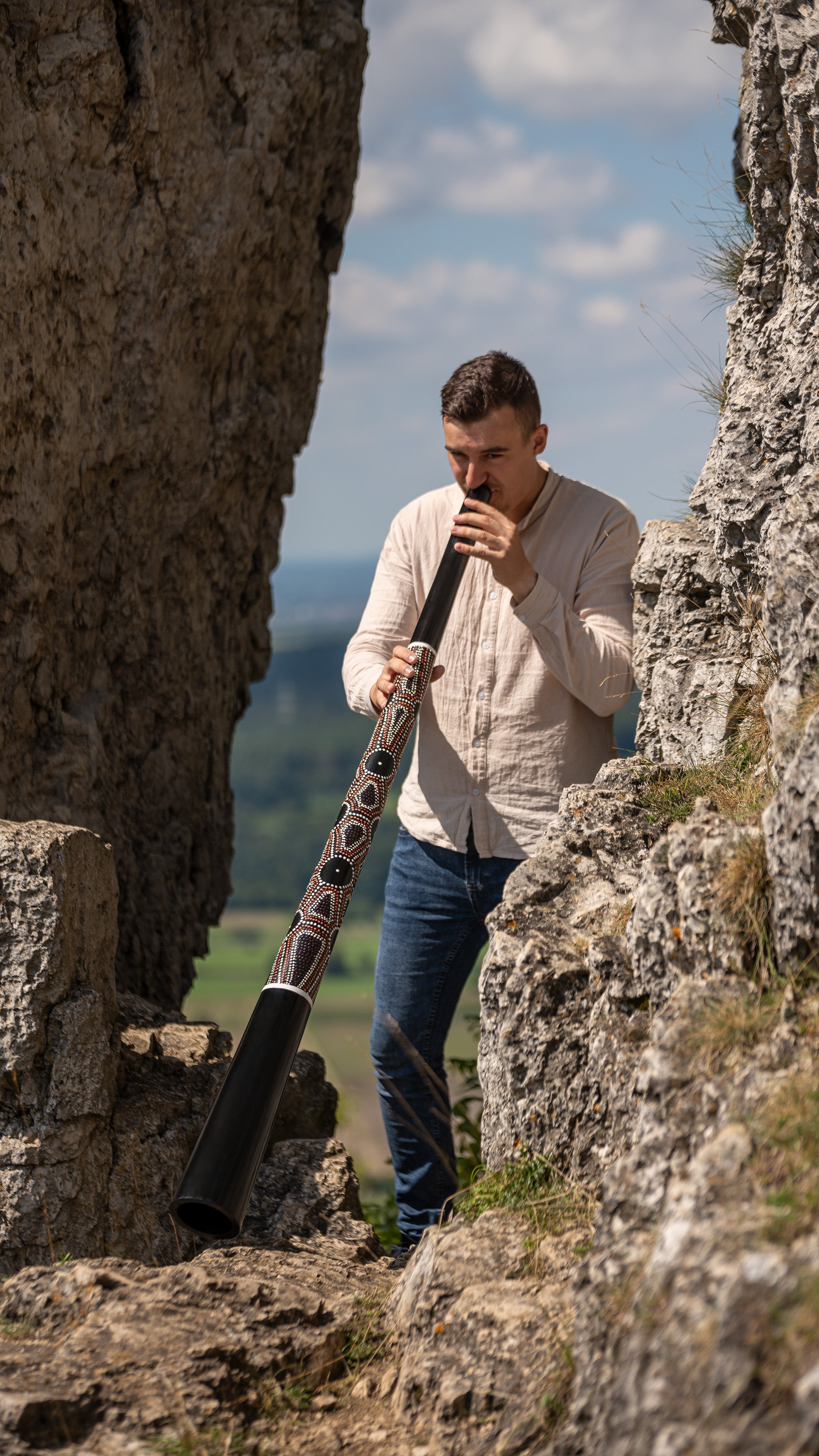 Experience authentic Aboriginal sounds with this 61.2" Black Sliced Pro Didgeridoo in E. Crafted from mahogany with traditional dot-painting and... Read more