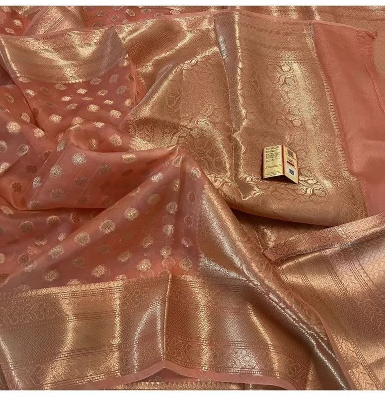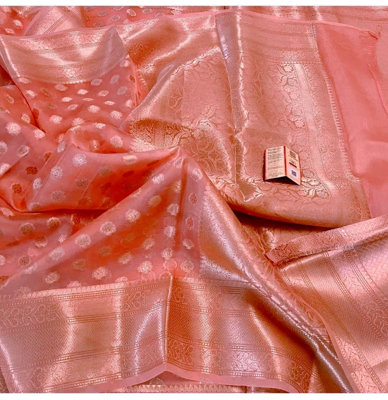 Our Pure Kora Silk Saree is made from the finest fabrics, featuring a traditional banarasi border and stripe zari work.... Read more