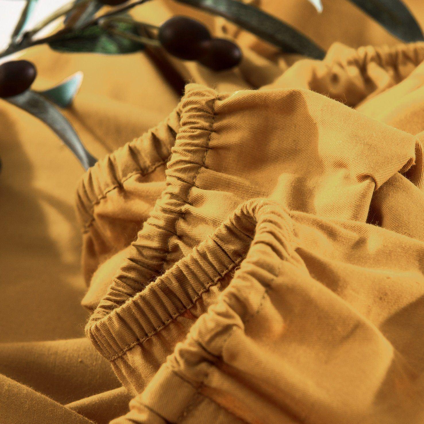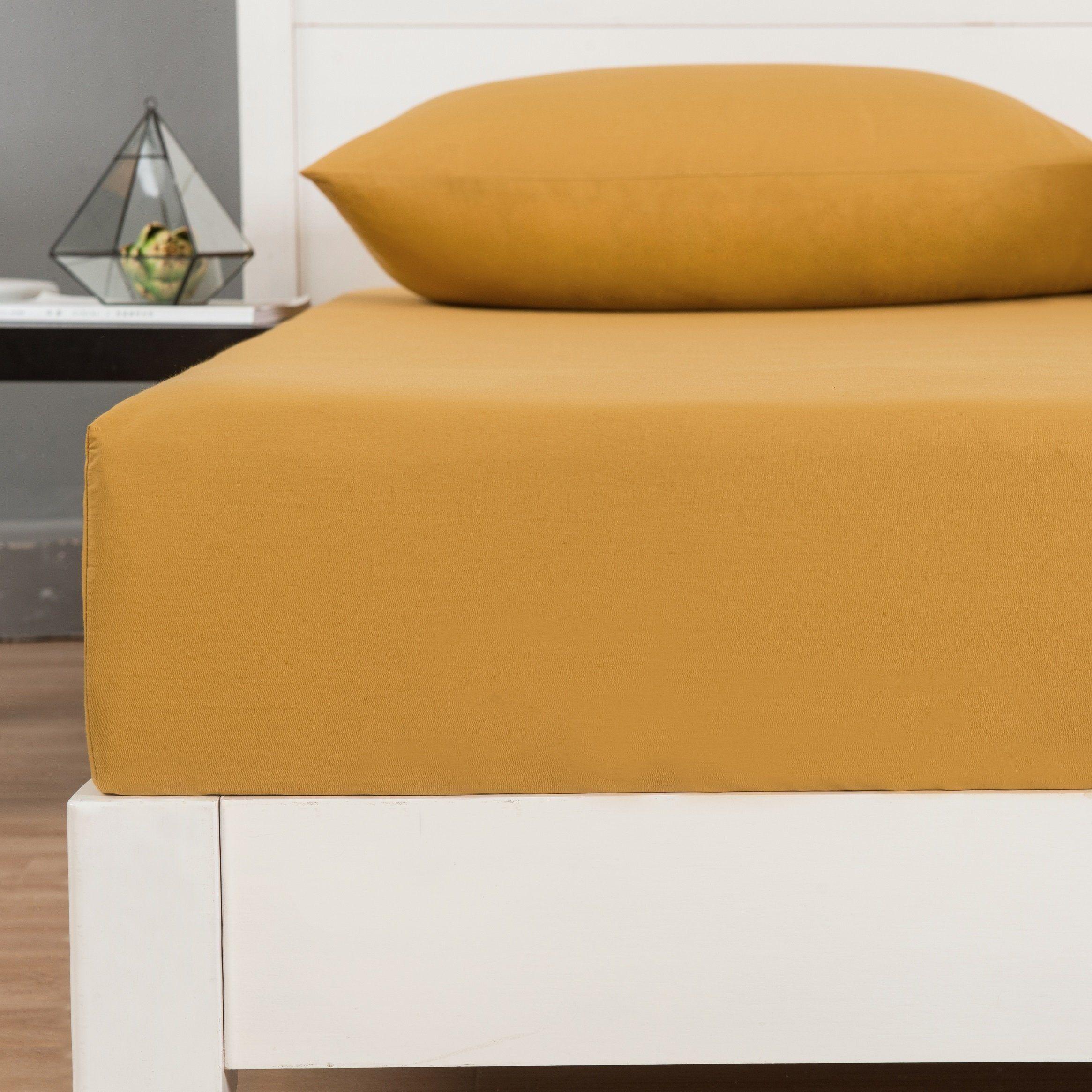 This fitted sheet set is a solid warm toned honey yellow shade with a 14” standard pocket in this modern yet