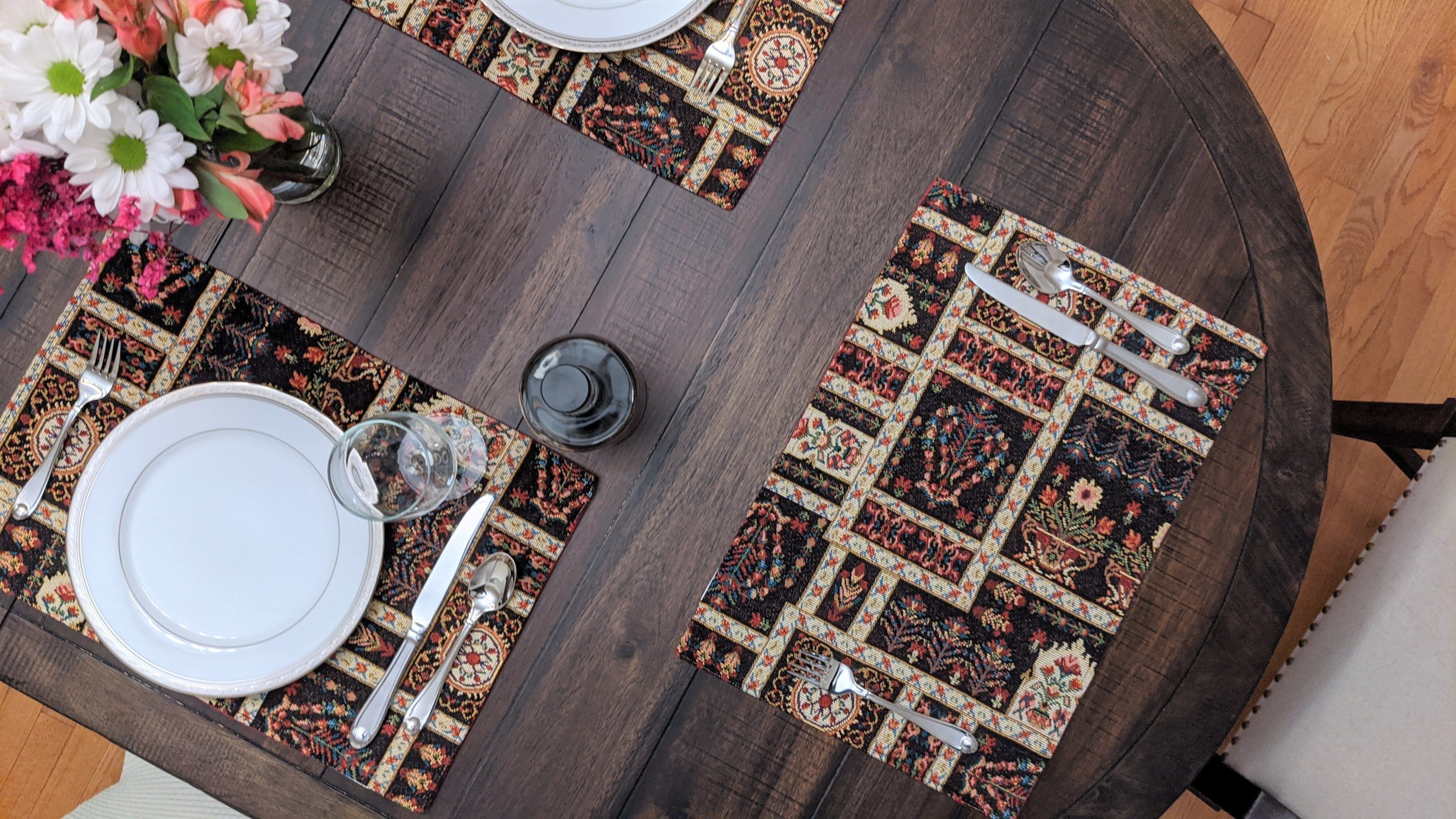 DaDa Bedding Set of 8 Pieces Dark Botanical Mughal Floral Table Woven Black Tapestry - 4 Placemats, 2 Table Runners, 2 Throw Pillow Covers (18197)