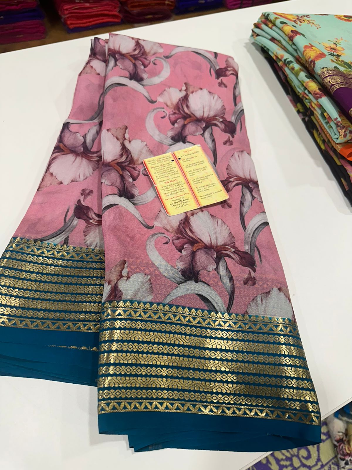 Embrace the versatility of this Mysore Silk Saree with digital floral prints, as it effortlessly combines the heritage of Mysore silk with the contemporary aesthetics of digital artistry.