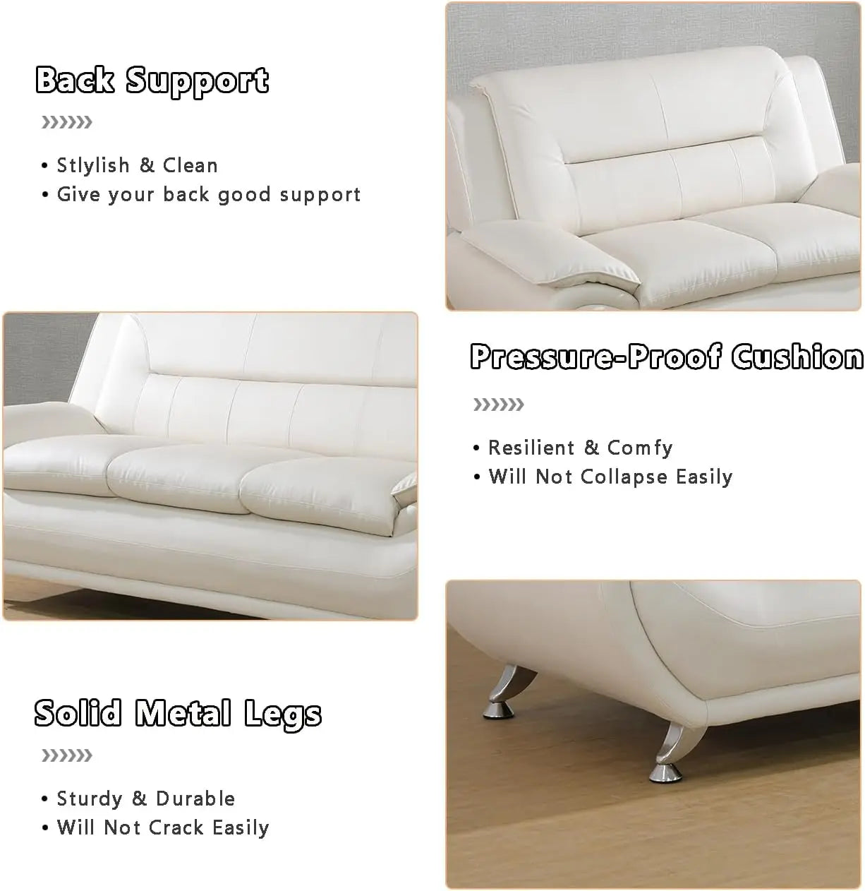 The surface of the white faux leather is easy to clean. Just wipe it gently with a damp cloth to remove stains. There is no need for complex cleaning steps, saving you time and energy and keeping your sofa clean and tidy at all times.