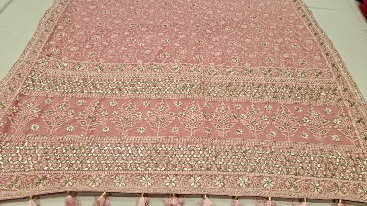 Experience the elegance of our Exclusive Chikankari Georgette Fabric Saree, handcrafted with intricate Gota Patti work. Each piece is a work of art, showcasing the beauty of traditional Indian craftsmanship. Elevate your style with this luxurious saree and make a statement at any occasion.