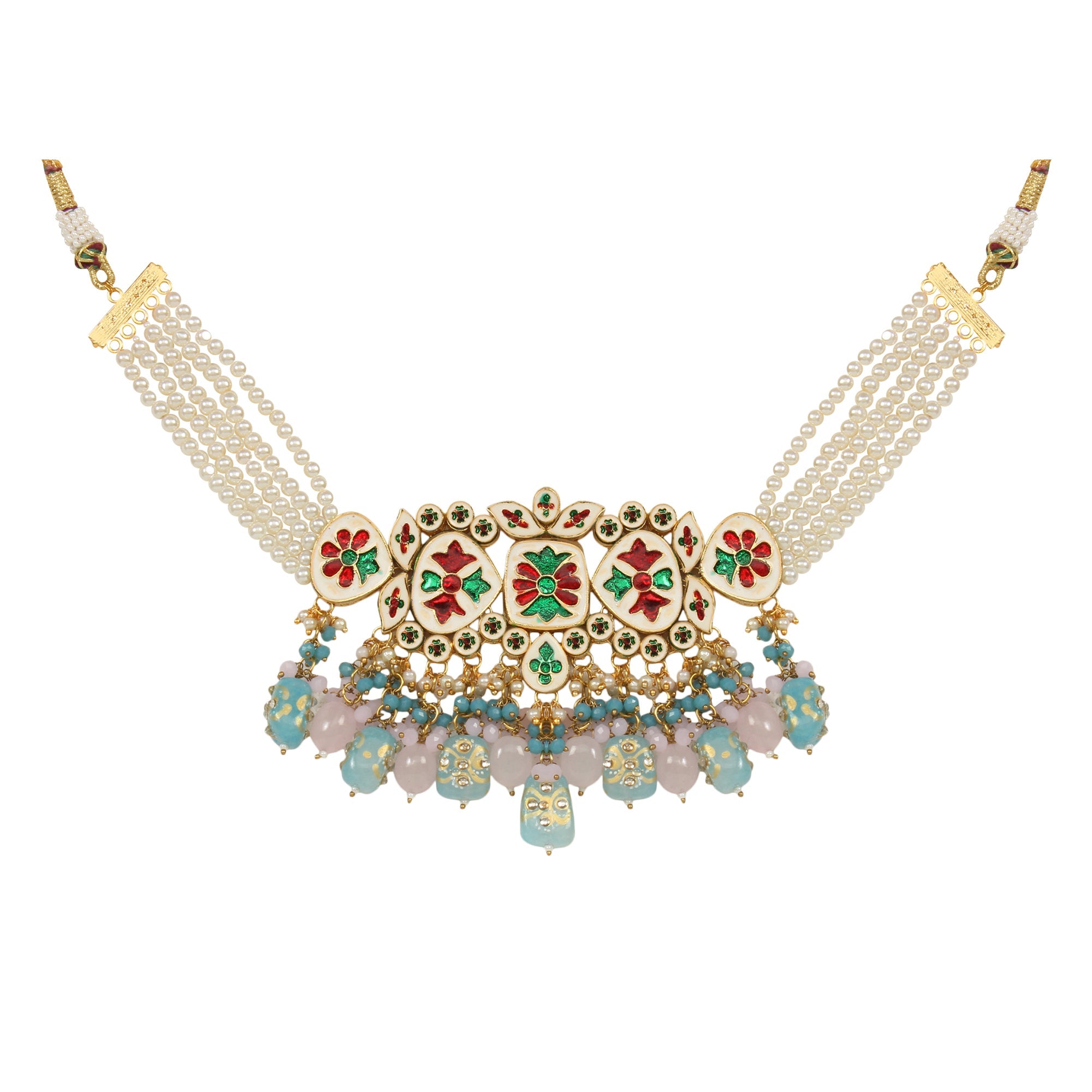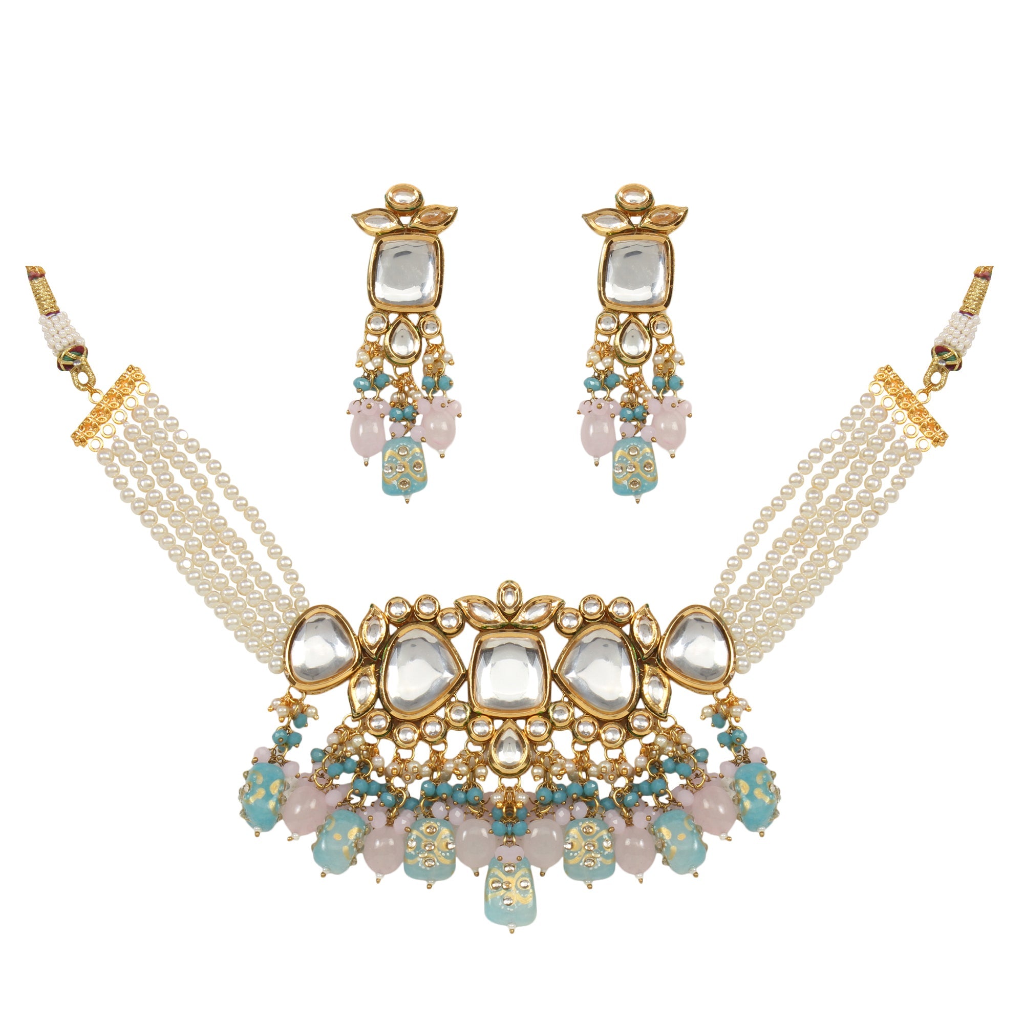 Tanjore Beaded Kundan Pastel Blue and Pink Necklace with Earrings