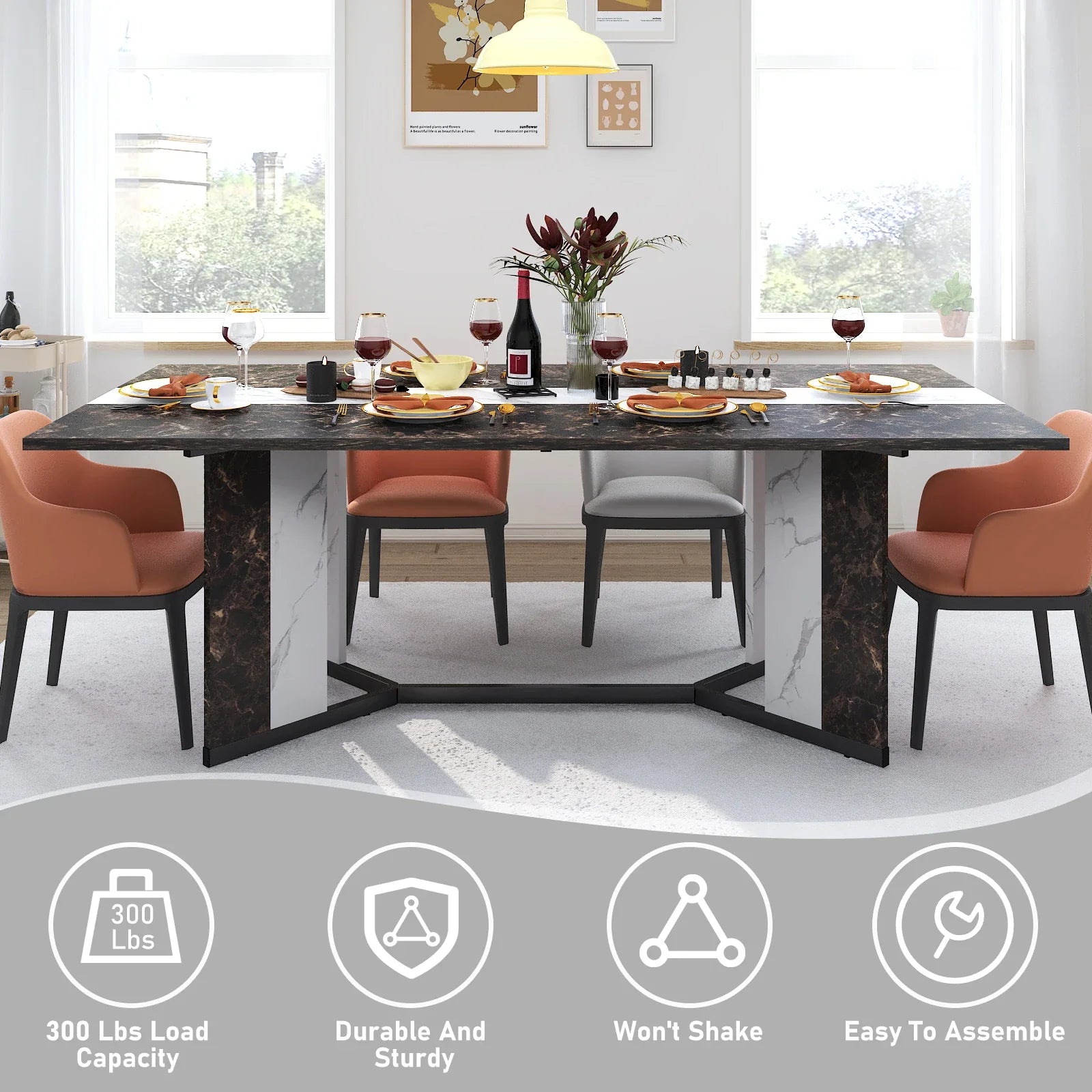 Beneath its pristine marble-inspired surface, a V-shaped metal and wood base ensures unwavering stability while making a striking visual statement. Crafted for both luxury and durability, its scratch-resistant, waterproof finish keeps your space pristine, no matter the occasion.
