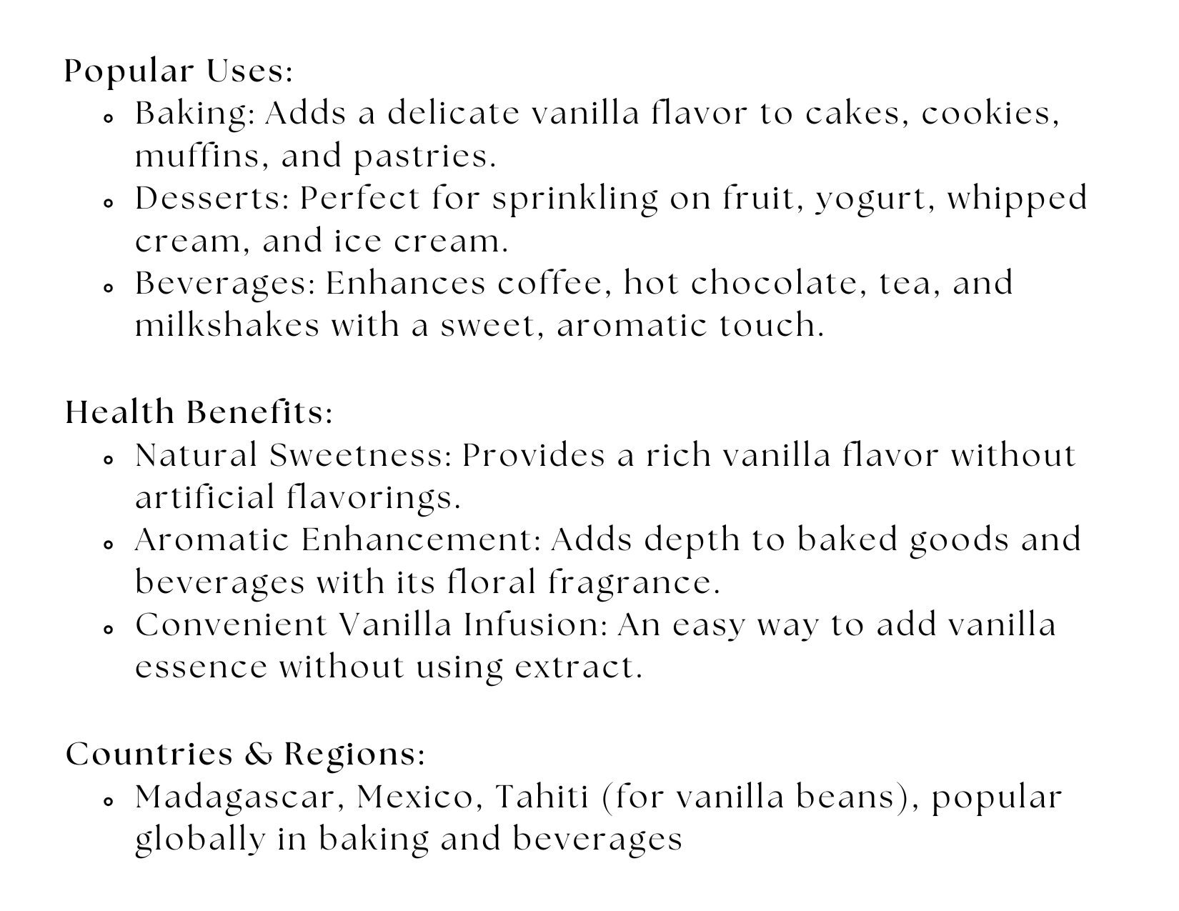 Vanilla sugar is granulated sugar infused with natural vanilla beans, giving it a sweet floral aroma and rich vanilla flavor. Read more